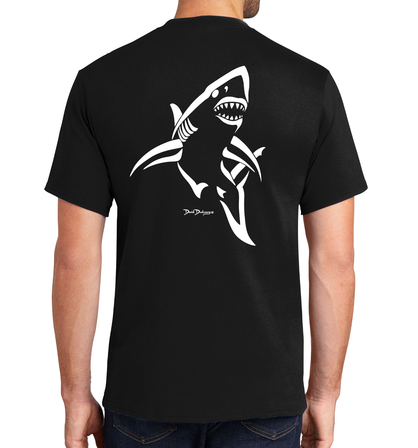 David Dunleavy Shark Deco Short Sleeve Cotton T-Shirt features a one color Vintage Shark Deco Design on the left chest and a Shark Deco Design on the back.