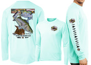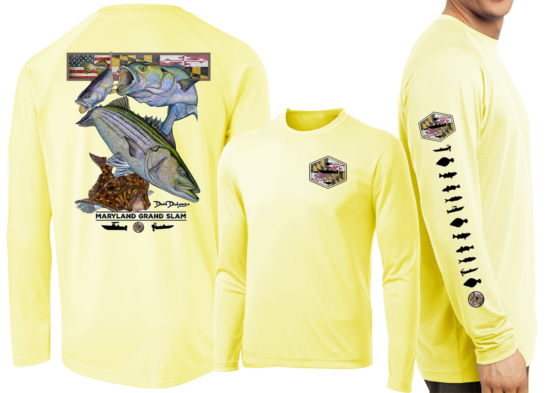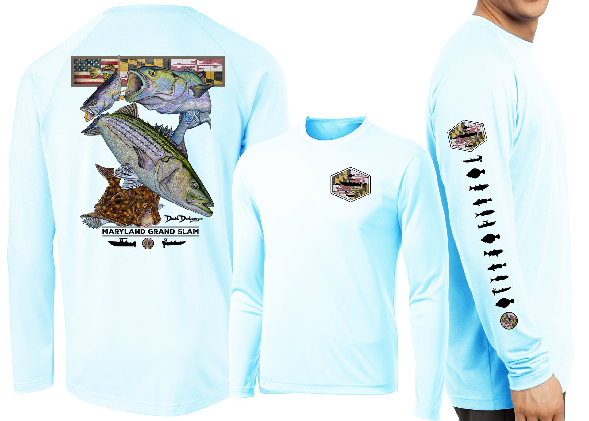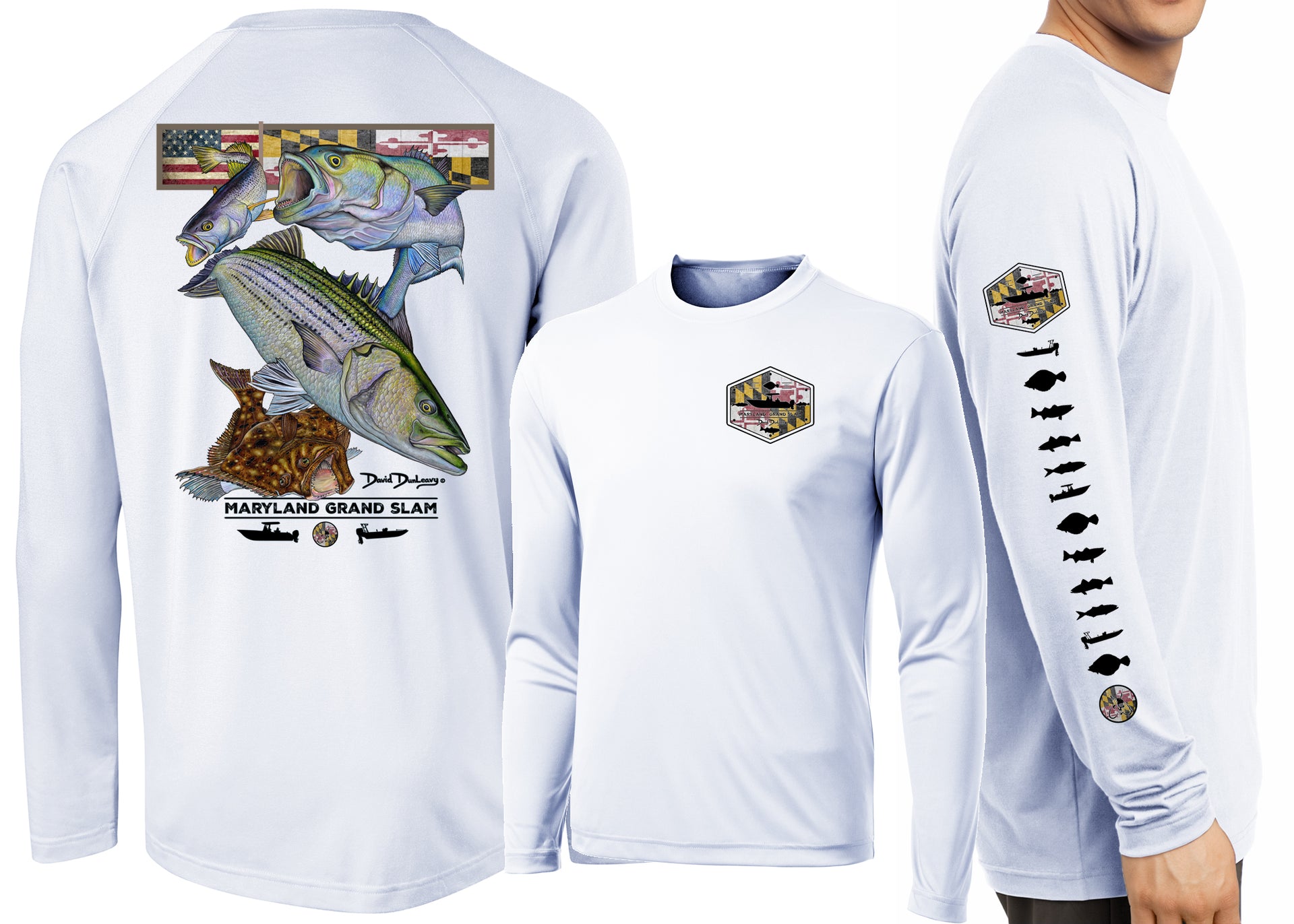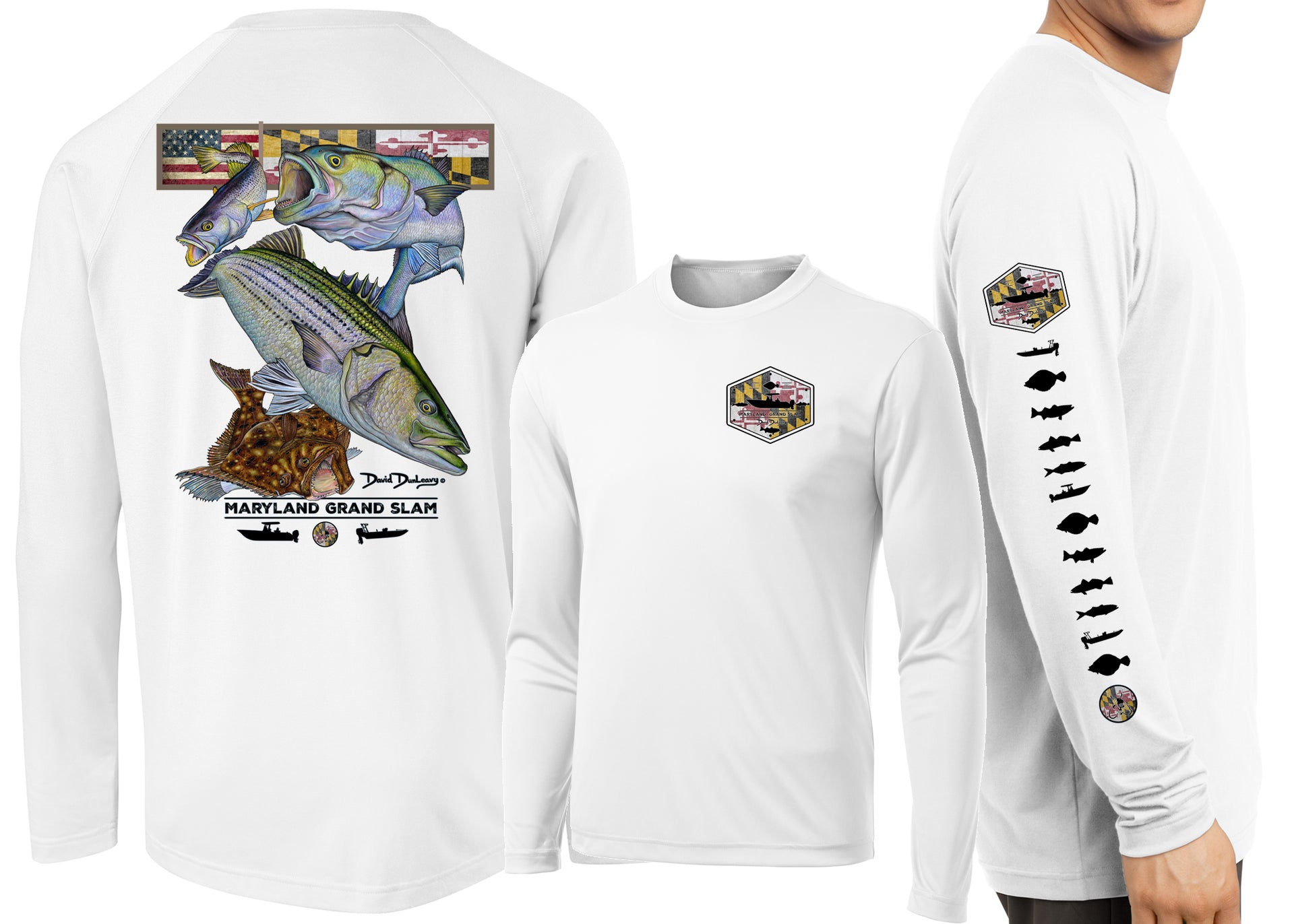David Dunleavy’s Men's Maryland Grand Slam Long Sleeve Performance Long Sleeve T-shirt features extreme details of a rockfish, flounder, bluefish, weakfish & Maryland flag. Dunleavy's stunningly realistic design on the back, Deco Designs on the left chest and sleeve keeps you looking great while protecting you from the elements. Breathable lightweight performance T-shirt looks great with shorts or jeans. Machine washable.