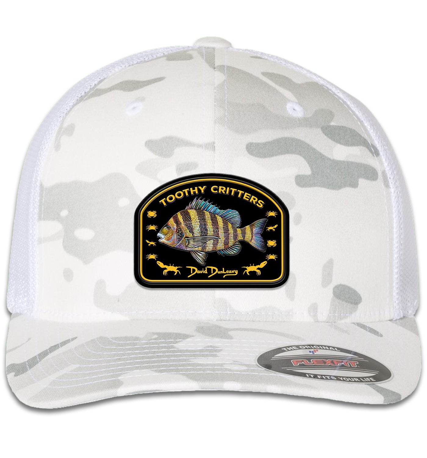 Sheepshead Toothy Critters Camo Permacurv Visor Six Panel Trucker Flexfit Hat with mesh back. The Perfect Sheepshead Toothy Critters Camo Hat for the warm climates, plenty of ventilation with the mesh. Our comfortable cap is designed to use on and off the water. Sheepshead Toothy Critters Hat Patch along with great fit will have you calling this your favorite everyday Hat. One Size Fits Most