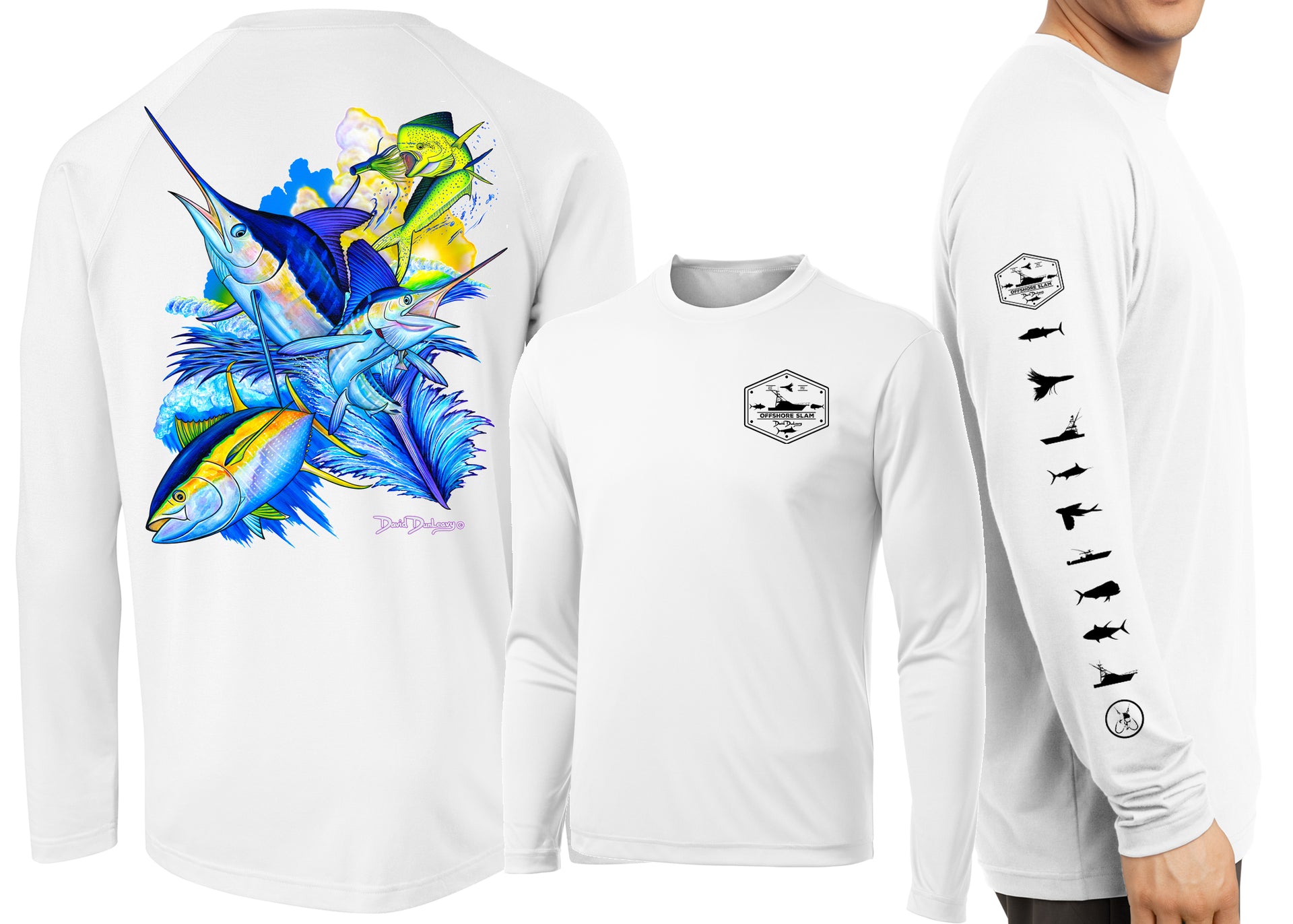 Experience the incredible artistry of the Men's Performance Offshore Slam Long Sleeve, designed by renowned marine life artist David Dunleavy. This top showcases stunning illustrations of a blue marlin, white marlin, yellowfin tuna & mahi mahi. With lifelike artwork on the back and Deco Designs on the left chest and sleeve, this shirt offers both style and sun protection. Made with lightweight, breathable fabric, it's perfect for any activity and can be easily washed for convenience.