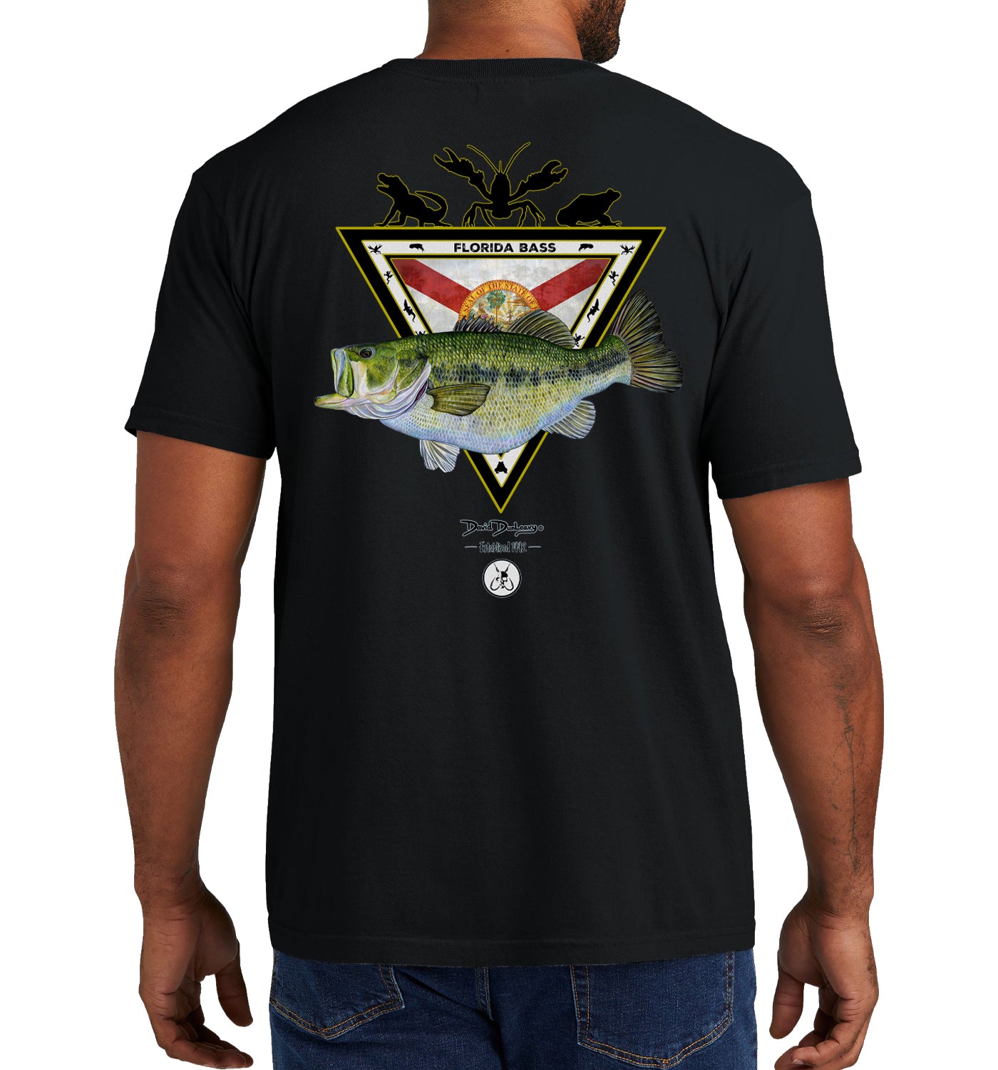 Discover the perfect addition to your wardrobe with the Men's Florida Bass Short Sleeve Garment Dyed Pocket T-Shirt by David Dunleavy. Showcasing a realistic illustration of Florida Largemouth Bass, along with Florida's state flag, crayfish, alligators, and frogs on the back, this shirt is a must-have for any freshwater enthusiast. The left chest pocket features the Florida flag, largemouth bass, crayfish, alligator, and frog designs. Pair it with shorts or jeans for a stylish and practical look. Machine washable for convenience.