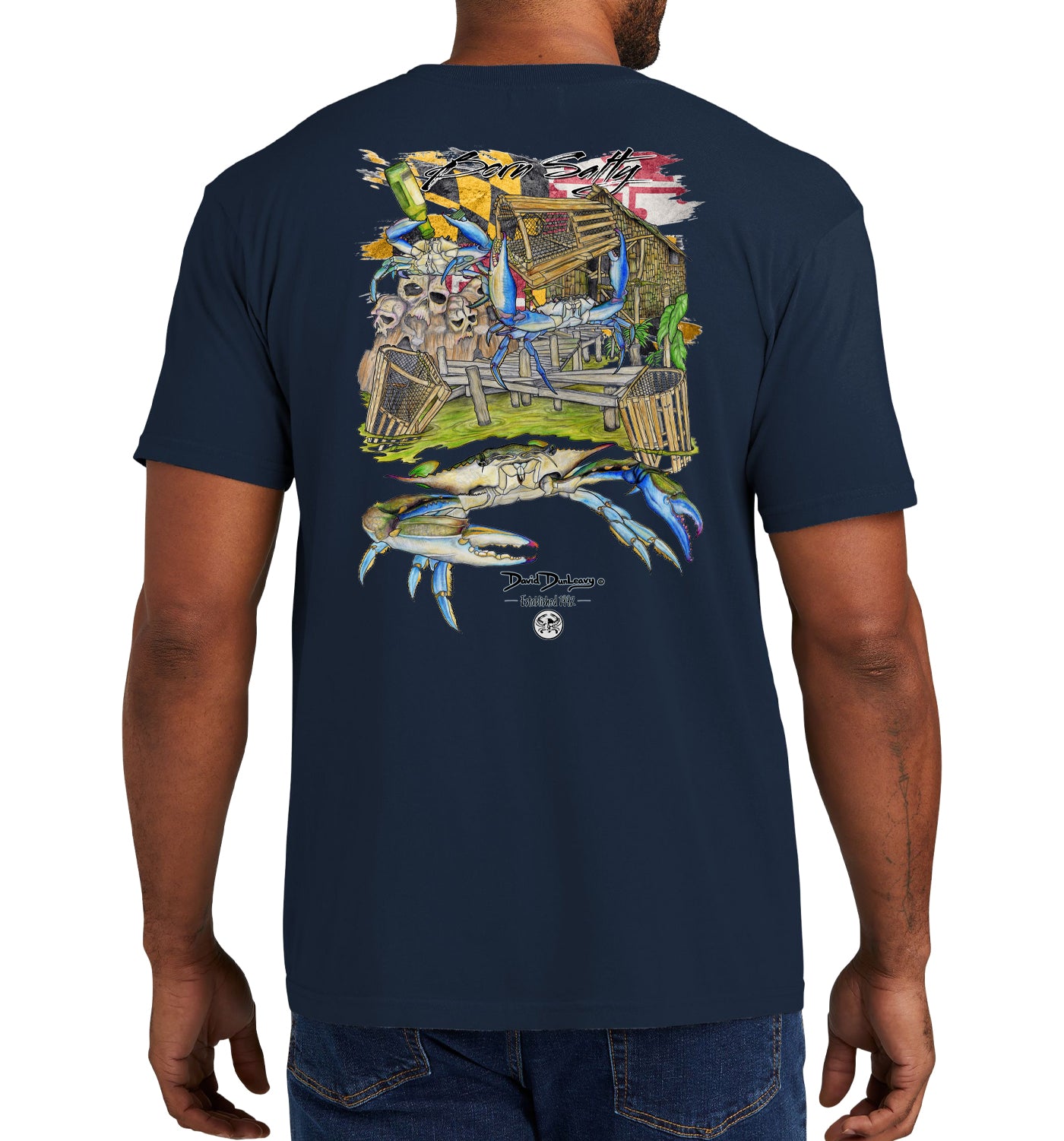 Celebrate the Chesapeake Bay spirit in this garment-dyed short-sleeve tee that captures the essence of Maryland coastal living. Featuring a vibrant blue crab graphic on the front and the state flag with blue crabs on the back, this cotton shirt delivers authentic bay culture style. The left chest pocket detail adds character and a relaxed, approachable feel perfect for anyone who embraces the Born Salty lifestyle. Easy to care for and endlessly versatile, it works just as well with shorts on a summer day as it does layered under a jacket. For those who live and breathe Chesapeake Bay pride, this is your go-to tee.