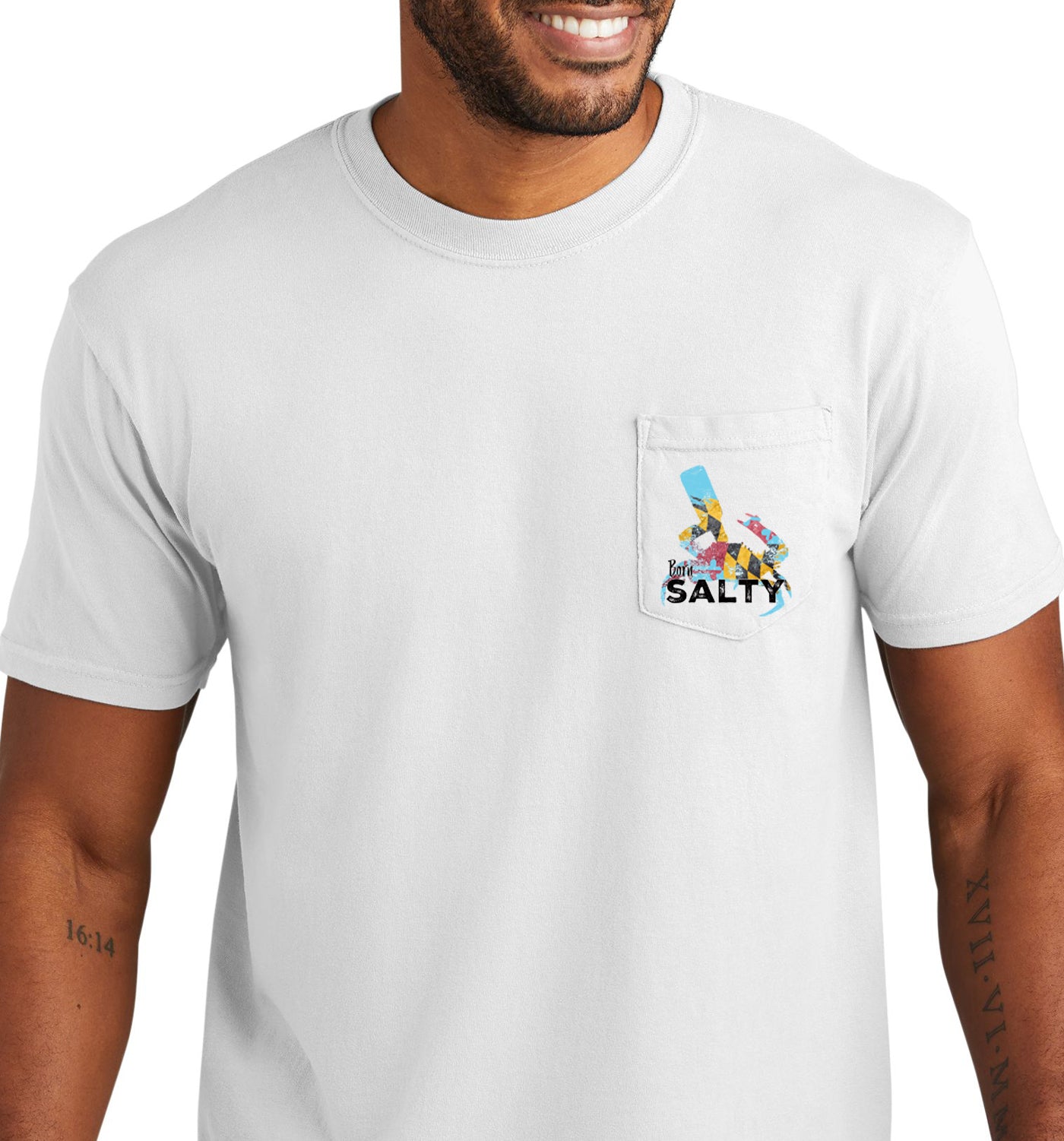 Celebrate the Chesapeake Bay spirit in this garment-dyed short-sleeve tee that captures the essence of Maryland coastal living. Featuring a vibrant blue crab graphic on the front and the state flag with blue crabs on the back, this cotton shirt delivers authentic bay culture style. The left chest pocket detail adds character and a relaxed, approachable feel perfect for anyone who embraces the Born Salty lifestyle. Easy to care for and endlessly versatile, it works just as well with shorts on a summer day as it does layered under a jacket. For those who live and breathe Chesapeake Bay pride, this is your go-to tee.