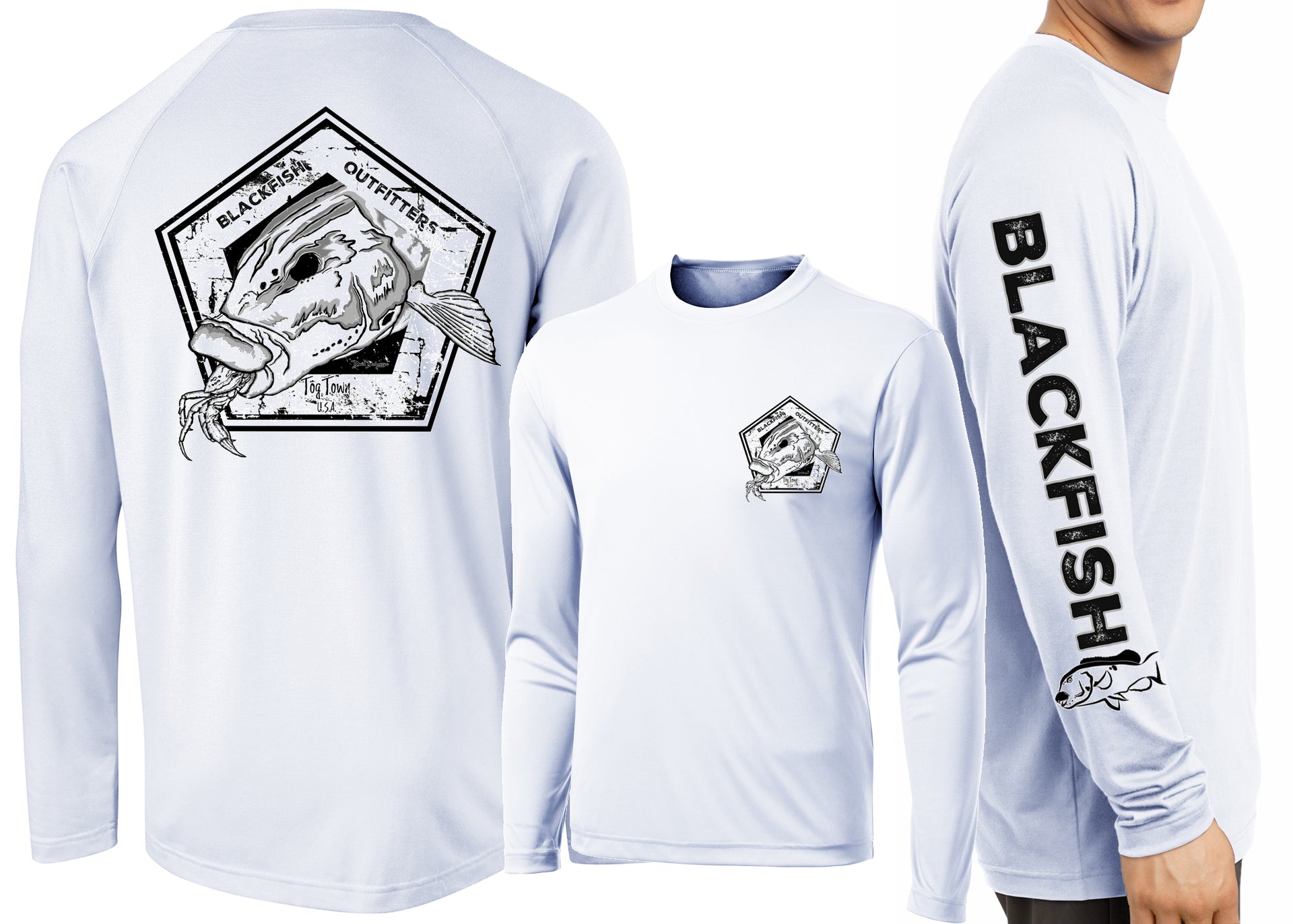 David Dunleavy’s Blackfish Outfitters features Left Chest, Sleeve and Back Blackfish/Tautog Design on a Long Sleeve Performance T-Shirt. Dunleavy's Blackfish Design on the back, Blackfish Designs on the left chest and sleeve keeps you looking great while protecting you from the elements.
