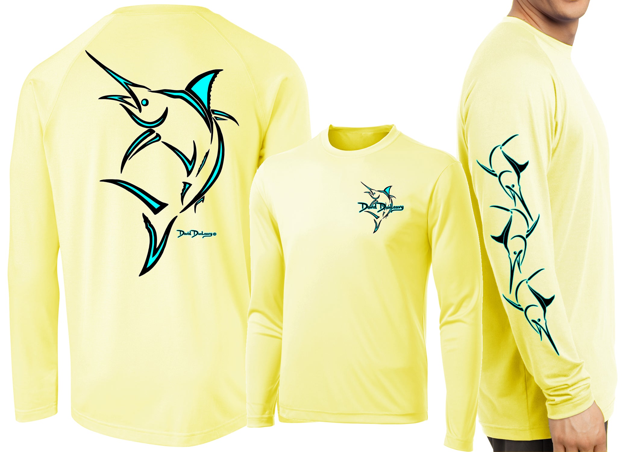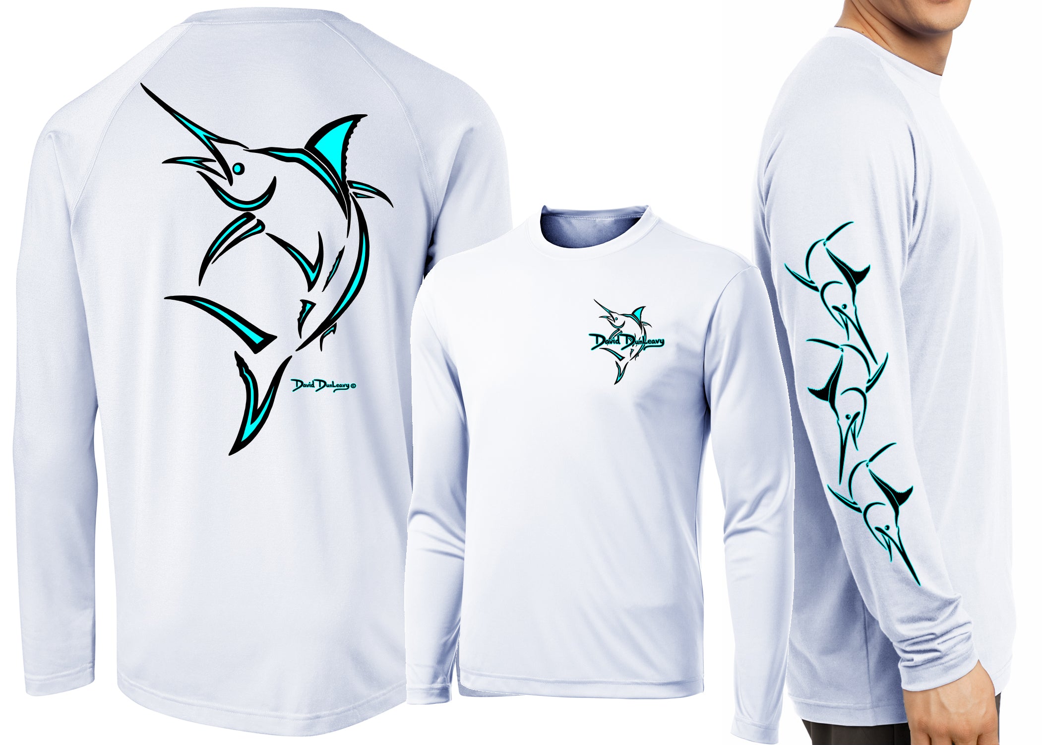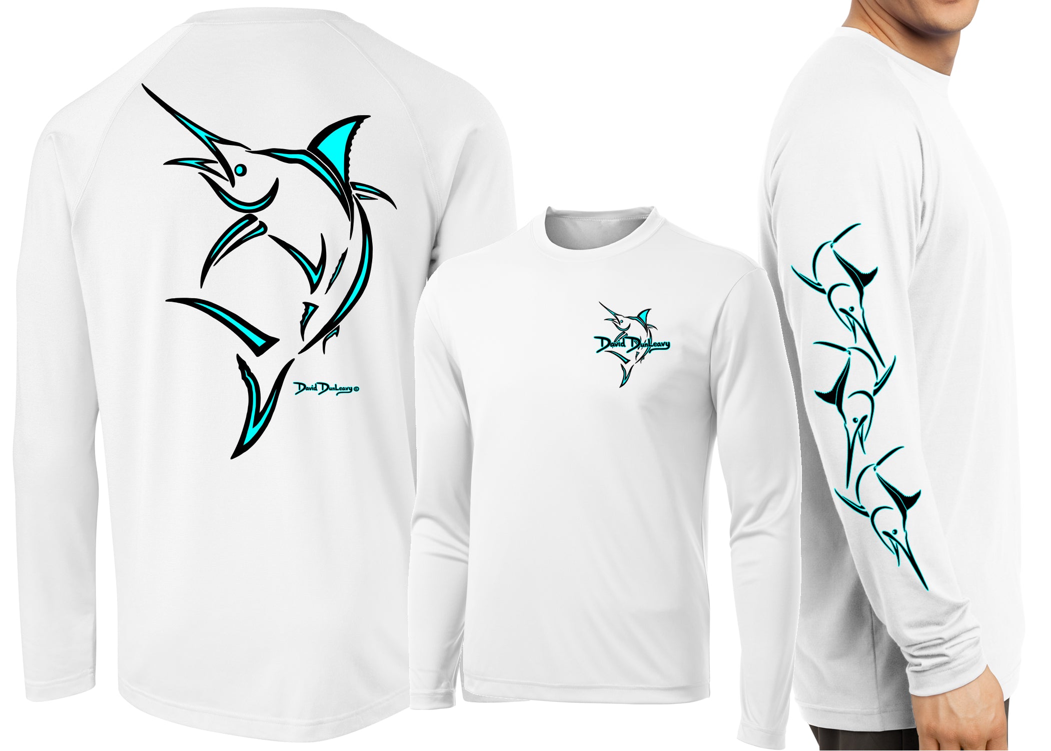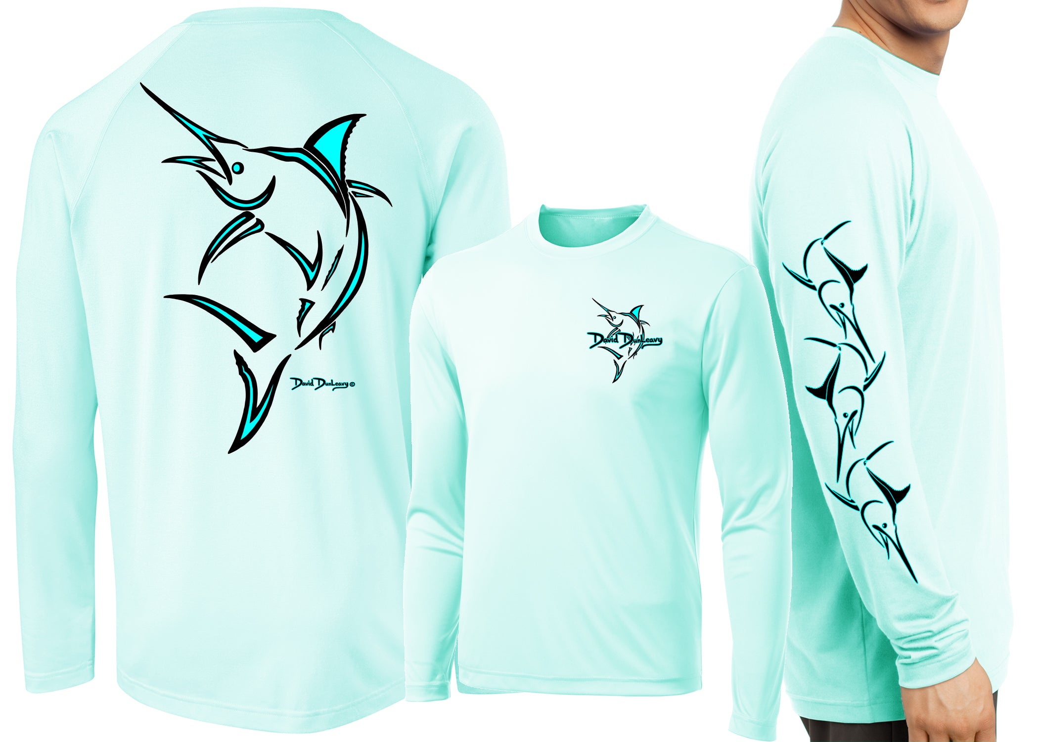 The Artwork: David Dunleavy’s Vintage Marlin Deco showcases a Marlin design on the left chest, sleeve, and back of this long sleeve performance shirt, printed with dye sublimation. Dye sublimation method is a digital printing technique that uses heat to embed dye into polyester fabric, making sure the artwork stays 100% breathable. Printed in the U.S.A.