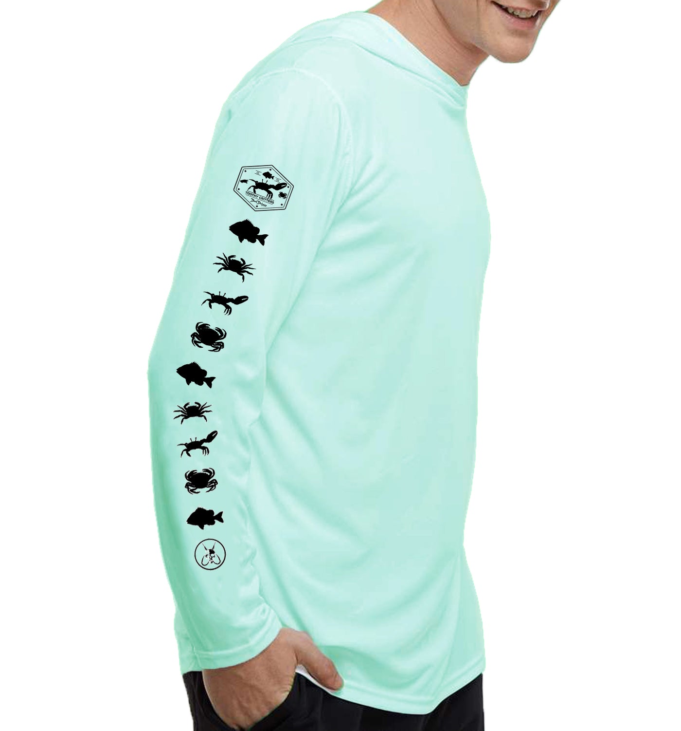 Achieve superior style and protection with David Dunleavy’s Men's Sheepshead Toothy Critters Long Sleeve Performance Hoodie. The detailed illustration of a Sheepshead, accompanied by fiddler crabs, Asian crabs, muddy crabs, and sand fleas, is meticulously designed by Dunleavy. This vivid artwork adorns the back, while matching Sheepshead graphics on the left chest and sleeve complete the aesthetic. Made from breathable, lightweight performance fabric, this hoodie provides all-weather comfort and pairs seamlessly with shorts or jeans. It is also machine washable for hassle-free care.