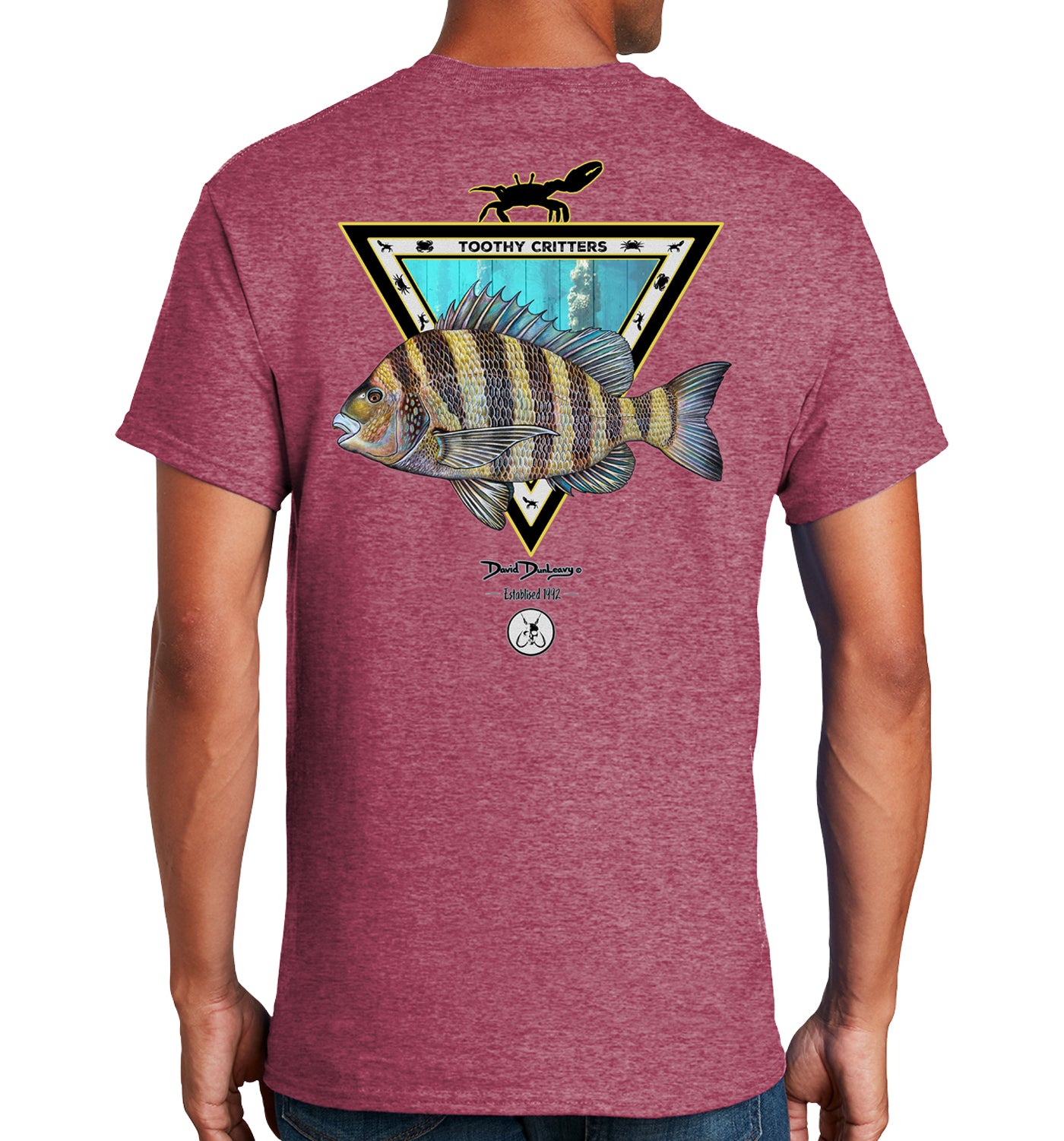 Experience the beauty and power of the ocean with David Dunleavy's Sheepshead Toothy Critters. This short sleeve t-shirt showcases stunning designs of Sheepshead, Fiddler Crab, Asian Crab, and Green Crab. The left chest features a one color Sheepshead Deco Design, while the back boasts a realistic and vibrant depiction. Perfect for any nature lover, this cotton t-shirt is a must-have for your wardrobe.
