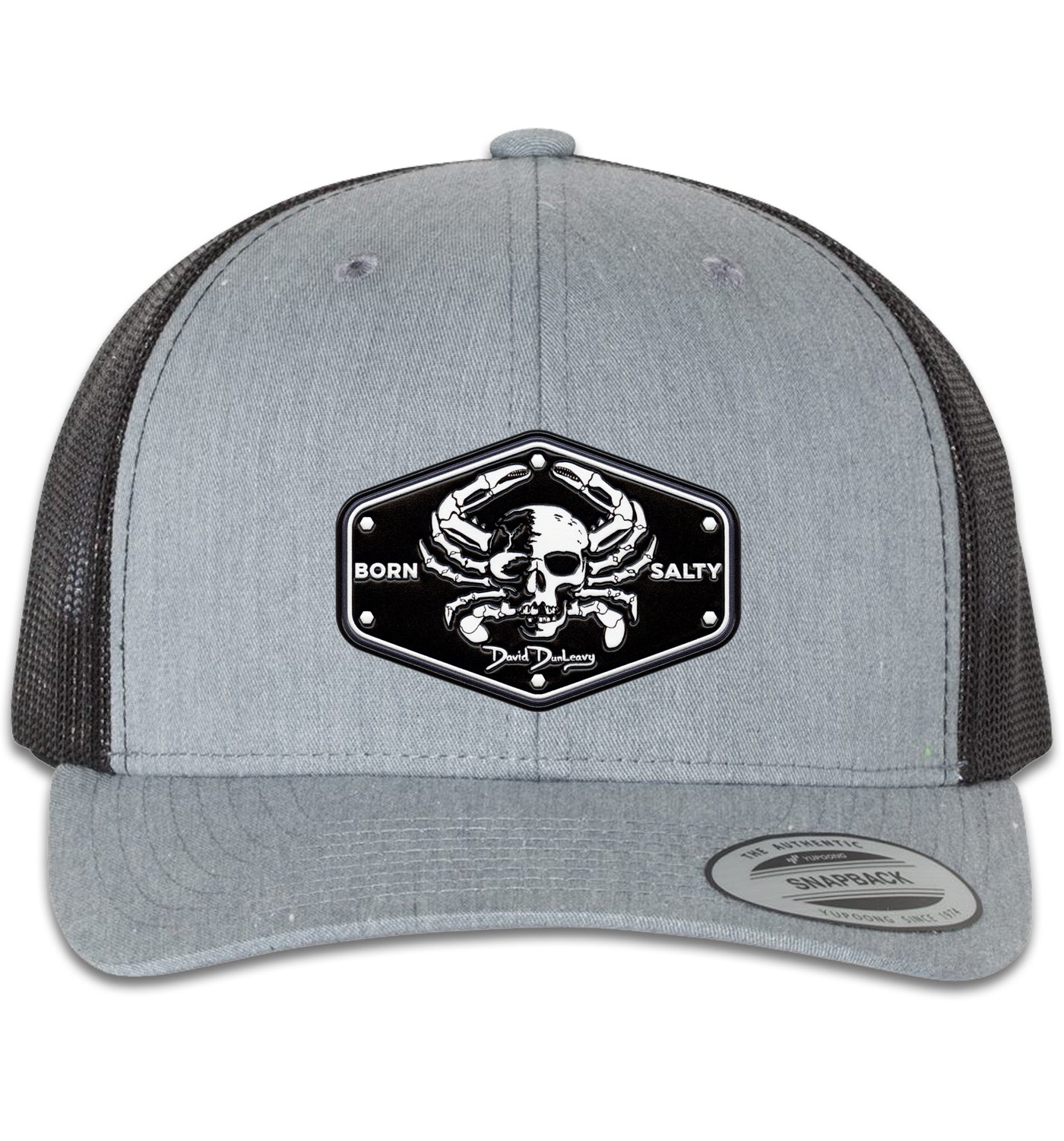 Born Salty Skull Crab 6 Panel Trucker Snap Back Hat Heather Grey Black