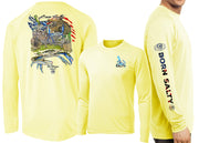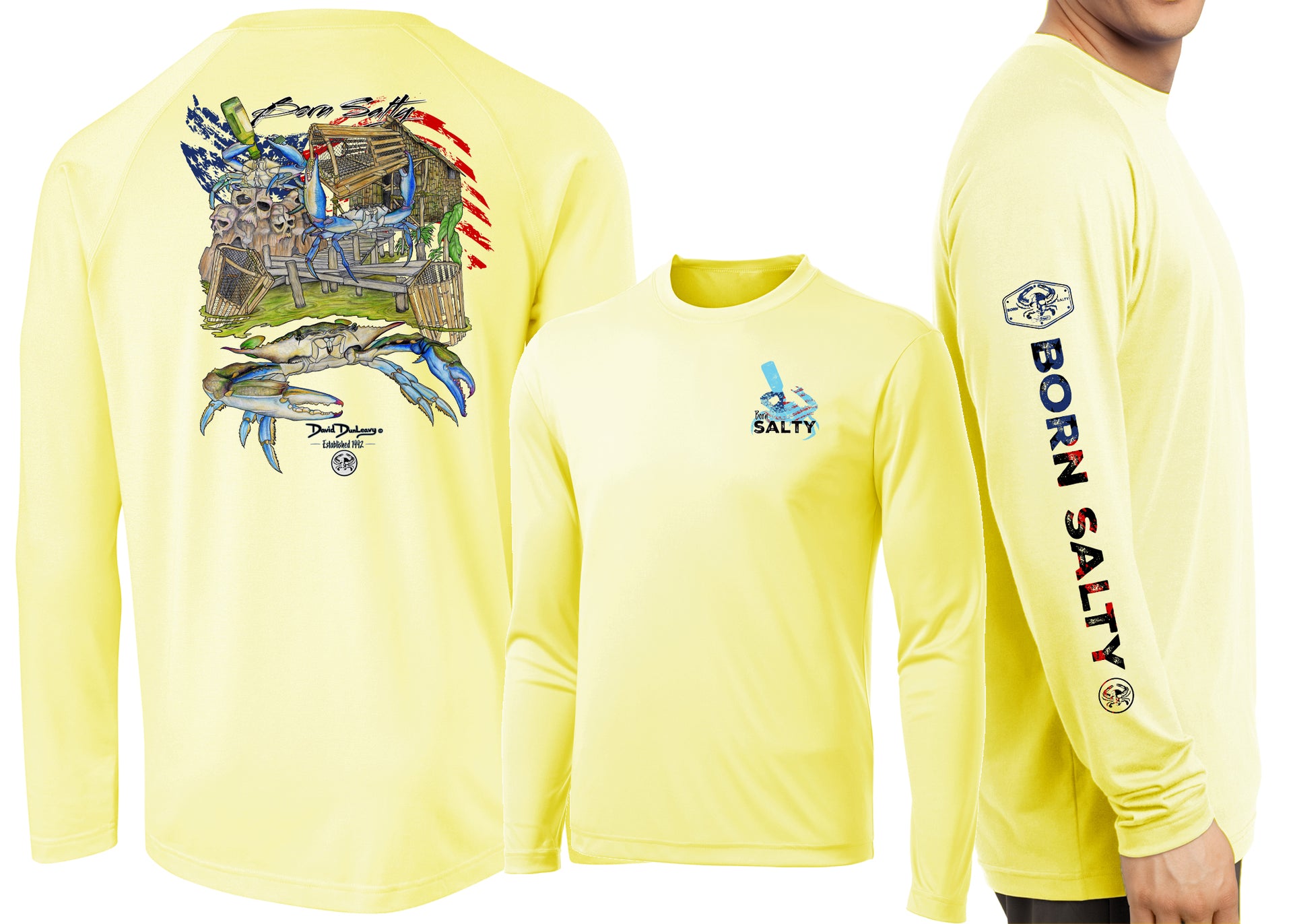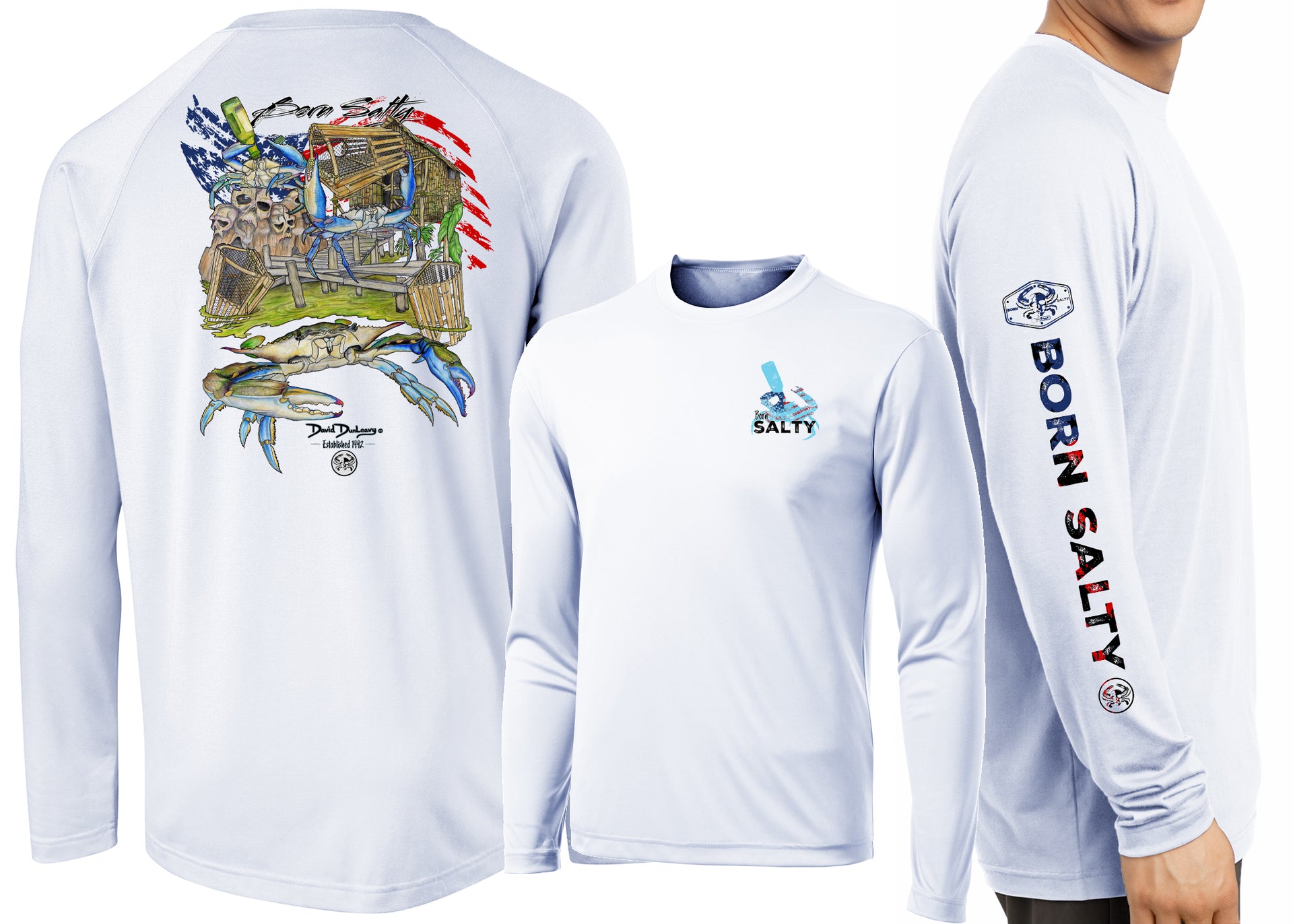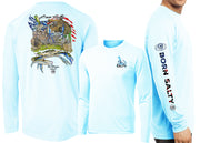 Embrace your inner coastal enthusiast with this Men's Performance Born Salty American Blue Crab Long Sleeve, featuring David Dunleavy's signature blue crab design across the back, chest, and sleeves. The lightweight, breathable performance fabric handles sun, wind, and unexpected weather changes with ease, making it perfect for beach days and beyond. Whether paired with shorts for a relaxed vibe or layered over denim for added versatility, this shirt delivers style that matches your active lifestyle. Easy care means machine washing keeps it looking fresh, so you can spend less time on laundry and more time chasing salt-soaked adventures.