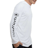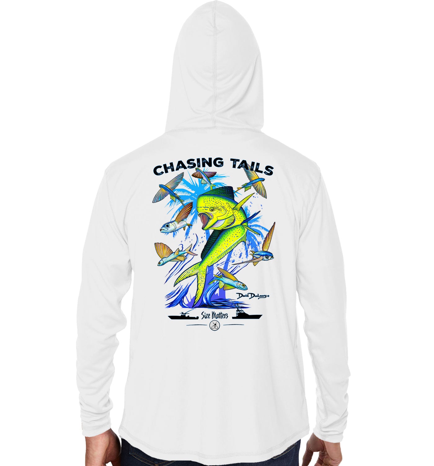 Enhance your look and shield yourself from the elements with David Dunleavy’s Men's Chasing Tails Mahi Arctic Blue Performance Hoodie. This performance hoodie features exquisite illustrations of a mahi mahi, flying fish, sport fishing boats, and lure designs. The lifelike artwork on the back, accompanied by Deco Designs on the left chest and sleeve, provides both fashion and sun protection. Crafted with lightweight, breathable fabric, this performance hoodie is ideal for any pursuit. Easily washable for convenience.