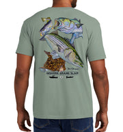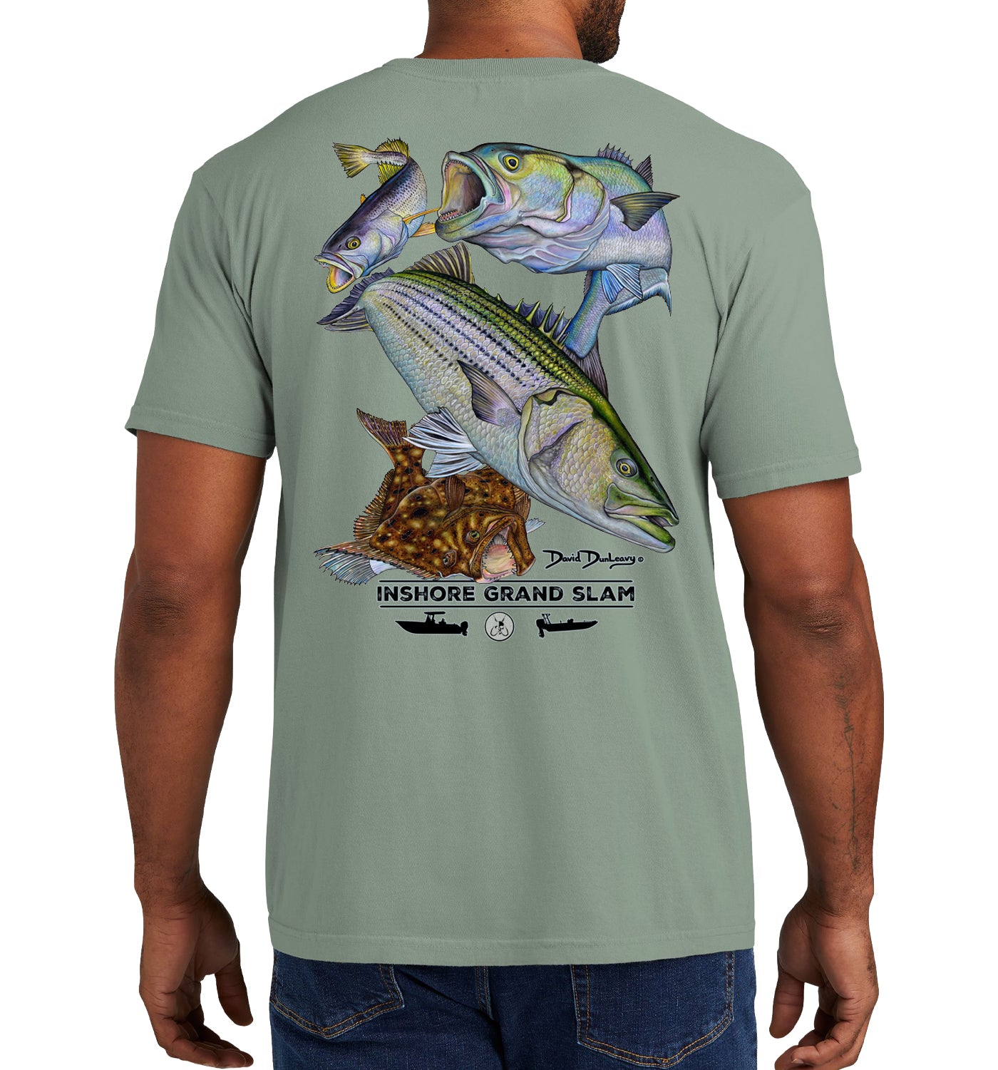 Experience the artistry of acclaimed marine life artist David Dunleavy with the Men's Inshore Grand Slam Short Sleeve Garment Dyed Bay Pocket T-Shirt. Featuring intricate images of striped bass, flounder, bluefish, and weakfish, this 100% cotton shirt offers unparalleled detail and all-day comfort. The back showcases Dunleavy's strikingly lifelike design, and the left chest pocket features the Dunleavy Deco Design. And, for added convenience, this shirt is machine washable.
