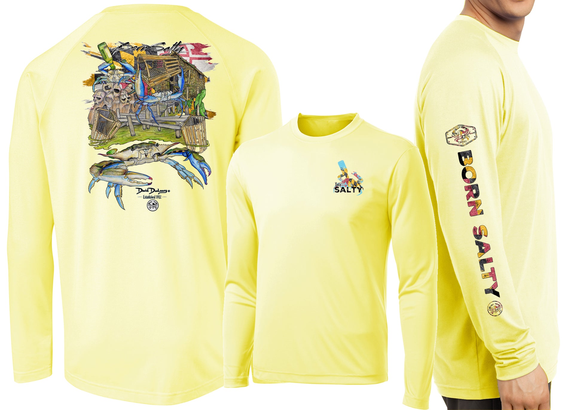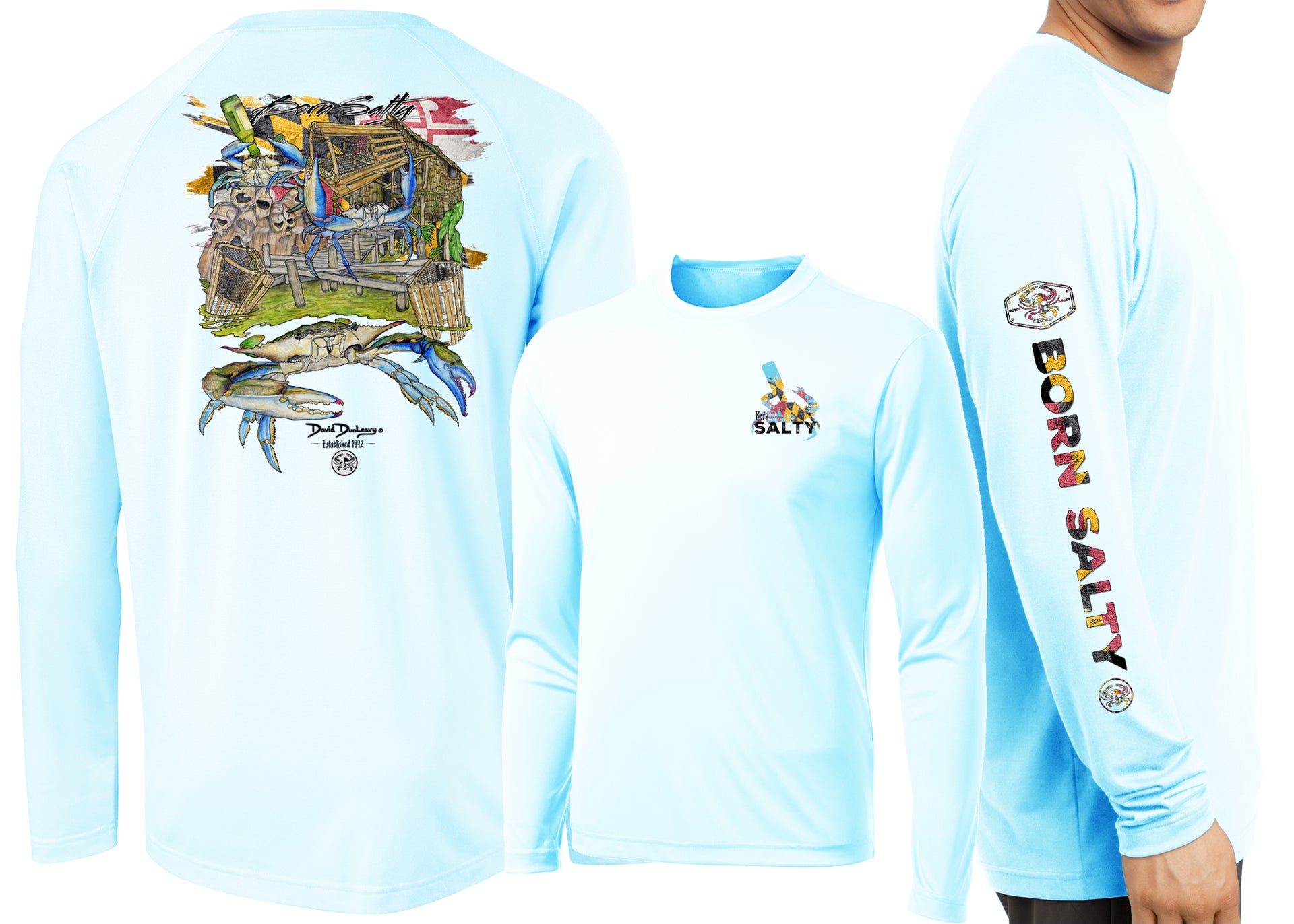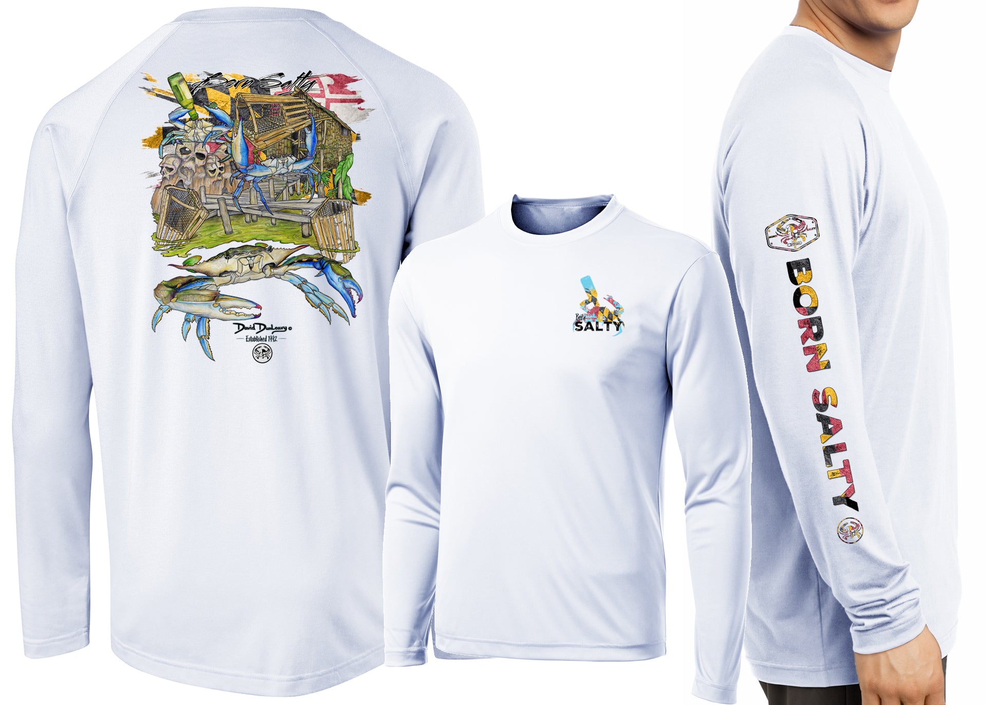 Engineered for those who embrace coastal living, this Men's Performance Born Salty Maryland Blue Crab Long Sleeve delivers UV protection wrapped in authentic Maryland heritage. The design showcases vibrant Born Salty Blue Crabs having a blast at the crab shack with David Dunleavy's intricate artwork across the back, left chest, and sleeves alongside the state flag—a celebration of Chesapeake Bay culture. Built from lightweight, breathable performance fabric, it adapts seamlessly to variable weather while maintaining comfort throughout the day. Whether paired with shorts or denim, this shirt transitions effortlessly between casual and active wear. Machine washable construction ensures durability and easy maintenance for extended product life.