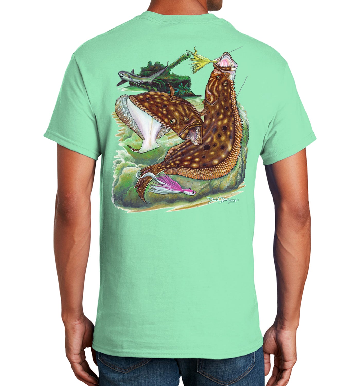 Add a touch of sophistication to your wardrobe with the Men's Flounder Reef Short Sleeve Mint Cotton T-Shirt by David Dunleavy. Expertly crafted with a realistic portrayal of two flounder chasing bucktail along an artificial reef, tank and thresher shark on the back, this shirt is a must-have for any nautical enthusiast. The left chest also features Dunleavy Deco Designs. Pair it with shorts or jeans for a practical and stylish look. Machine-washable for convenience.