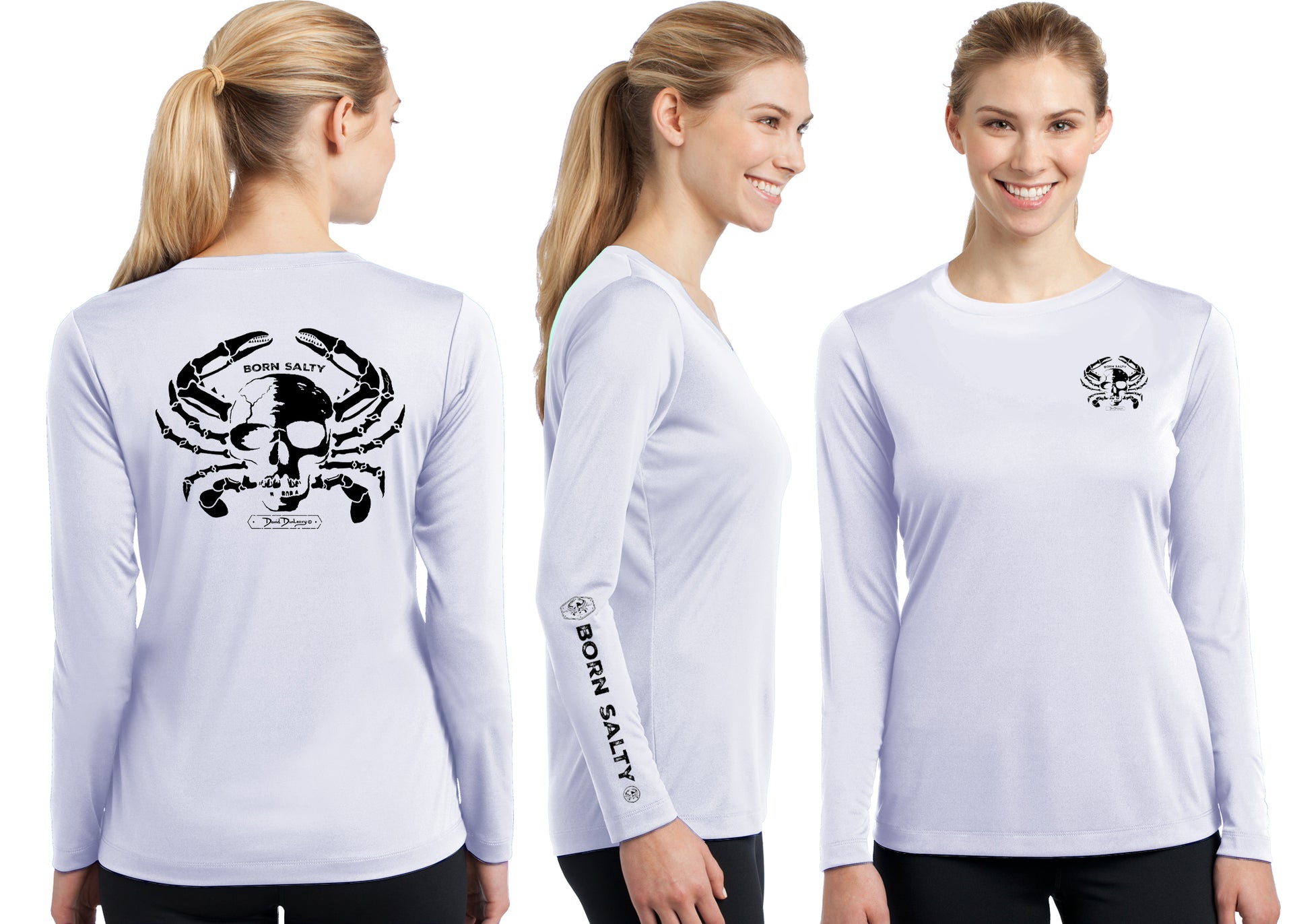 Rock the waves in style with this women's performance long sleeve tee featuring the legendary Born Salty Skull Crab graphic splashed across the back, chest, and sleeves. Designed for coastal adventurers who refuse to blend in, this shirt pairs bold, statement-making artwork with advanced performance fabric that keeps UV rays, wind, and moisture at bay. Perfect for water sports or everyday wear, you'll make waves while staying cool and protected from sunrise to sunset.