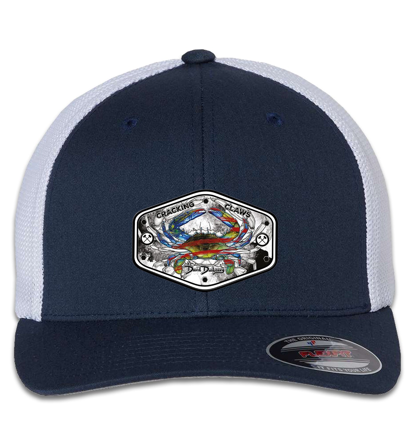 American Blue Crab Permacurv Visor Six Panel Trucker Flexfit Hat with mesh back. The Perfect American Blue Crab Hat for the warm climates, plenty of ventilation with the mesh. Our comfortable cap is designed to use on and off the water. American Blue Crabs Hat Patch along with great fit will have you calling this your favorite everyday Hat. One Size Fits Most