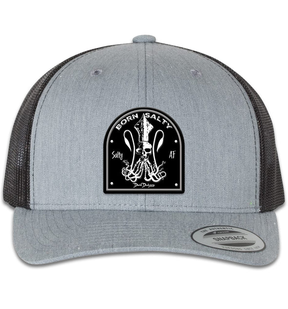 Born Salty Skull Kraken 6 Panel Trucker Snap Back Hat Heather Grey Black