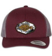 Flounder Kraken 6 Panel Trucker Snap Back Maroon Grey Hat