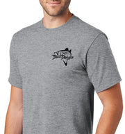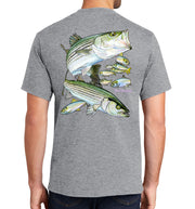 David Dunleavy Striped Bass Short Sleeve Cotton T-Shirt features a one color Vintage Striper Deco Design on the front left chest and a realistic colorful design on the back.